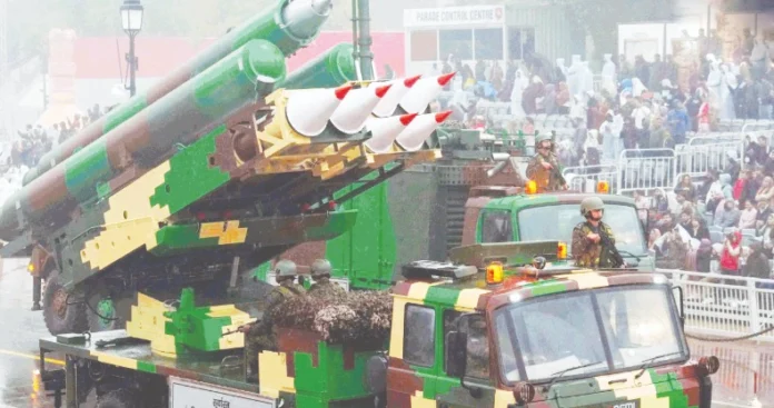 பீரங்கிகள், ஏவுகணை அமைப்புகள் மற்றும் வான் ஆயுதங்கள் அணிவகுப்பில் ஒன்றன் பின் ஒன்றாக அணிவகுத்துச் சென்றன. ஒரு மோதலின் போது இராணுவத்தின் பல்வேறு ஆயுதங்கள் எவ்வாறு இணைந்து செயல்படுகின்றன என்பதை இது நிரூபித்தது.குடியரசு தின அணிவகுப்பில் S-400 ஏவுகணைகள், பிரம்மோஸ் மற்றும் ஆகாஷ் ஏவுகணை அமைப்புகள், நடுத்தர தூர தரையிலிருந்து வான் ஏவுகணைகள், மேம்பட்ட இழுவை பீரங்கி துப்பாக்கி அமைப்பு, தனுஷ் பீரங்கி துப்பாக்கி, திவ்யஸ்திர பேட்டரி மற்றும் ட்ரோன்கள் ஆகியவற்றின் நிலையான காட்சி இடம்பெற்றது.