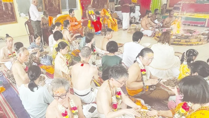 பழநியில் உள்ள புலிப்பாணி ஆசிரமத்தில் ஜப்பான் நாட்டைச் சேர்ந்தவர்கள் உலக நன்மை வேண்டி இன்று புதன்கிழமை (பிப்.25) காலை சிறப்பு யாகம் நடத்தி வழிபட்டனர்.