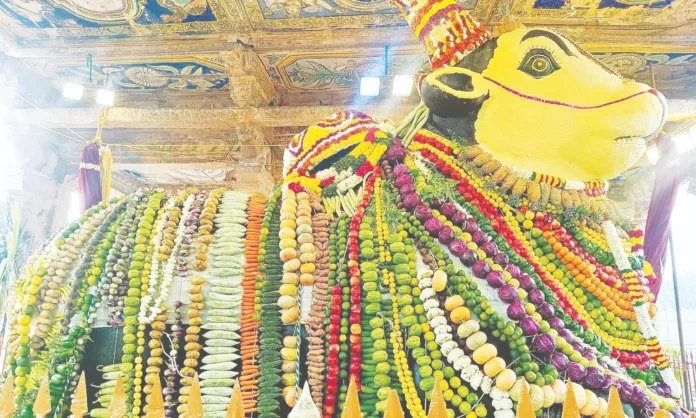 பின்னர் நந்தியெம்பெருமானுக்கு 2 டன் எடையிலான காய்கறிகள், பழங்கள், இனிப்பு வகைகள், பூக்களால் சிறப்பு அலங்காரம் செய்யப்பட்டது.