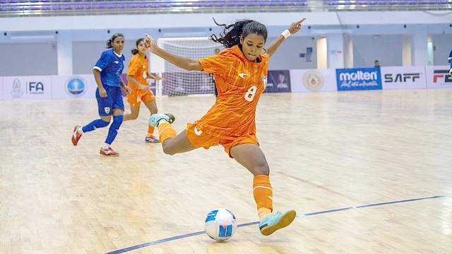 புதுடெல்லி, ஜன. 14- தெற்காசிய கால்பந்து கூட்டமைப்பு சார்பில் மகளிருக்கான புட்சால் சாம்பியன்ஷிப் போட்டி தாய்லாந்தில் நடைபெற்று வருகிறது.இதில் இந்திய அணி தனது முதல் ஆட்டத்தில் நேற்று மாலத்தீவுகளுடன் மோதியது. தொடக்கம் முதலே ஆதிக்கம் செலுத்திய இந்திய மகளிர் அணி 11-1 என்ற கோல் கணக்கில் வெற்றி பெற்று தொடரை சிறந்த முறையில் தொடங்கியது. இந்திய அணி சார்பில் குஷ்பு சரோஜ் 4 கோல்கள் (17, 22, 24, மற்றும் 26-வது நிமிடங்கள்) அடித்து அசத்தினார். ரித்திகா சிங் (6, 17-வது நிமிடங்கள்), சோனாலி (17, 37-வது நிமிடங்கள்), நிஷ்கா பிரகாஷ் (33, 34-வது நிமிடங்கள்) ஆகியோர் தலா 2 கோல்கள் அடித்தனர். முன்னதாக மிதிலா ரமணி (4-வது நிமிடம்) போட்டியின் முதல் கோலை அடித்தார். இந்திய அணியின் அச்சோம் டெஜியோ 39-வது நிமிடத்தில் சுயகோல் அடித்தார். இதன் காரணமாகவே மாலத்தீவுகள் ஒரு கோலை பதிவு செய்ய முடிந்தது. தாய்லாந்தில் தெற்காசிய கால்பந்து கூட்டமைப்பு சார்பில் மகளிருக்கான புட்சால் சாம்பியன்ஷிப் போட்டி நடைபெற்று வருகிறது. இதில் மாலத்தீவுகளுக்கு எதிரான ஆட்டத்தில் ஆக்ரோஷமாக விளையாடிய இந்திய வீராங்கனை.